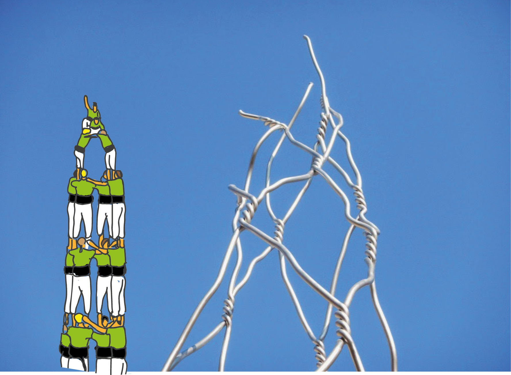 La escultura, formada por unos finos tubos de acero entrelazados en forma de torre cilíndrica, pretende expresar la fragilidad y la fuerza de unas torres humanas que se levantan con mucha voluntad y siempre tiemblan.